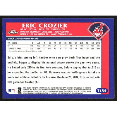 This is a 2003 Topps Chrome Traded Eric Crozier baseball card. The card is #T184 and pictures show condition. Team(s): Cleveland Indians Rookie Card (RC)
