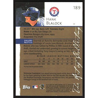 This is a 2003 Topps Gallery Artist's Proofs Hank Blalock baseball card. The card is #189 and pictures show condition.
