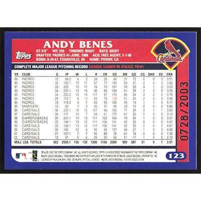 This is a 2003 Topps Gold Andy Benes baseball card. The card is #123 and pictures show condition. This card is limited; #'d 0728/2003. Team(s): St. Louis Cardinals