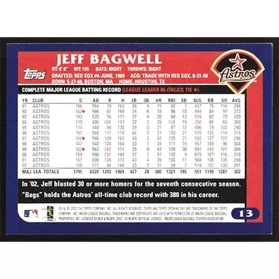 This is a 2003 Topps Opening Day Jeff Bagwell baseball card. The card is #13 and pictures show condition.