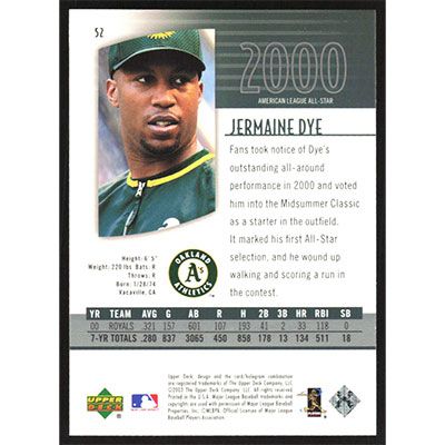 This is a 2003 UD Authentics Jermaine Dye baseball card. The card is #52 and pictures show condition.