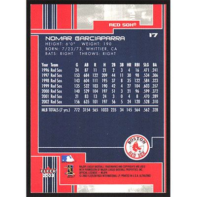 This is a 2003 Ultra Nomar Garciaparra baseball card. The card is #17 and pictures show condition.
