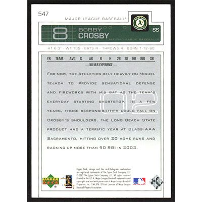This is a 2003 Upper Deck Bobby Crosby baseball card. The card is #547 and pictures show condition.
