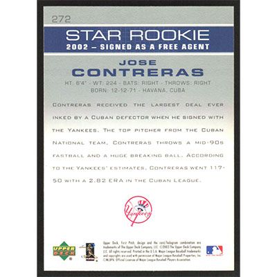 This is a 2003 Upper Deck First Pitch Jose Contreras Star Rookie short print baseball card. The card is #272 and pictures show condition. Team(s): New York Yankees Rookie Card (RC)