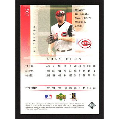 This is a 2003 Upper Deck Honor Roll Adam Dunn baseball card. The card is #102 and pictures show condition.