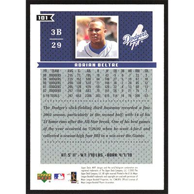 This is a 2003 Upper Deck MVP Adrian Beltre baseball card. The card is #101 and pictures show condition.