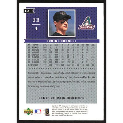 This is a 2003 Upper Deck MVP Craig Counsell baseball card. The card is #12 and pictures show condition.