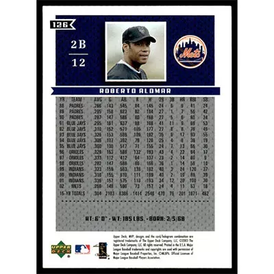 This is a 2003 Upper Deck MVP Roberto Alomar baseball card. The card is #126 and pictures show condition.
