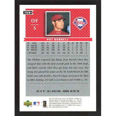 This is a 2003 Upper Deck MVP Pat Burrell baseball card. The card is #159 and pictures show condition.