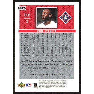This is a 2003 Upper Deck MVP Carl Everett baseball card. The card is #204 and pictures show condition.