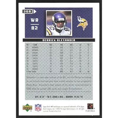 This is a 2003 Upper Deck MVP Derrick Alexander football card. The card is #268 and pictures show condition.