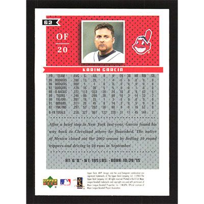 This is a 2003 Upper Deck MVP Karim Garcia baseball card. The card is #62 and pictures show condition.