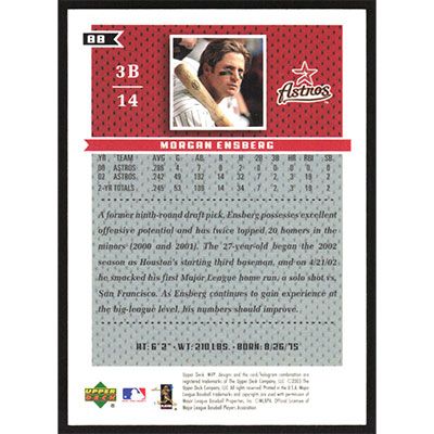 This is a 2003 Upper Deck MVP Morgan Ensberg baseball card. The card is #88 and pictures show condition.