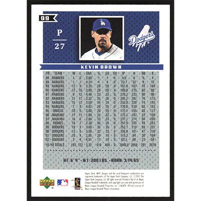 This is a 2003 Upper Deck MVP Kevin Brown baseball card. The card is #99 and pictures show condition.