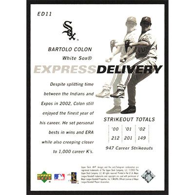 This is a 2003 Upper Deck MVP Express Delivery Bartolo Colon baseball card. The card is #ED11 and pictures show condition.