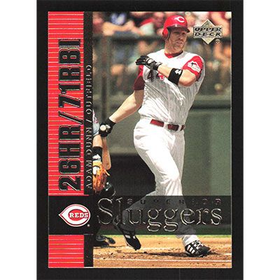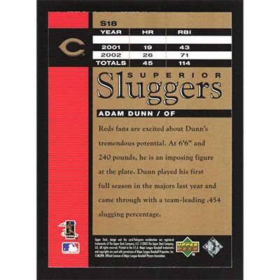 This is a 2003 Upper Deck Superior Sluggers Adam Dunn baseball card. The card is #S18 and pictures show condition.