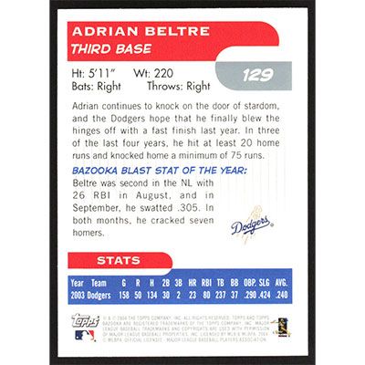This is a 2004 Bazooka Adrian Beltre baseball card. The card is #129 and pictures show condition.