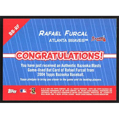 This is a 2004 Bazooka Blasts Bat Relics Rafael Furcal baseball card. The card is #BB-RF and pictures show condition.