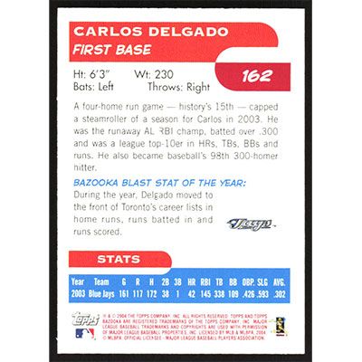 This is a 2004 Bazooka Red Chunks Carlos Delgado White Jersey baseball card. The card is #162 and pictures show condition.