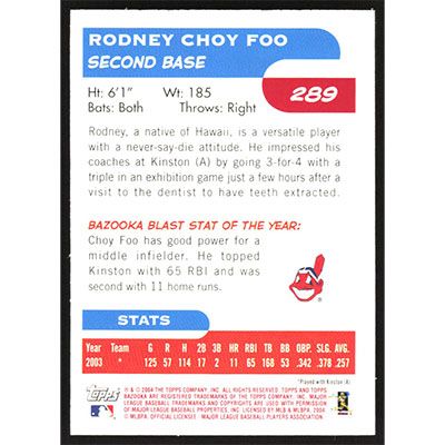This is a 2004 Bazooka Red Chunks Rodney Choy Foo First Year baseball card. The card is #289 and pictures show condition. Team(s): Cleveland Indians Rookie Card (RC)