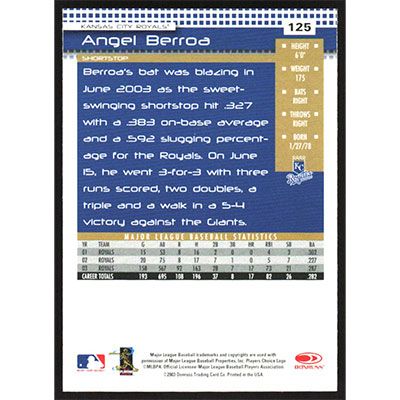 This is a 2004 Donruss Angel Berroa baseball card. The card is #125 and pictures show condition.