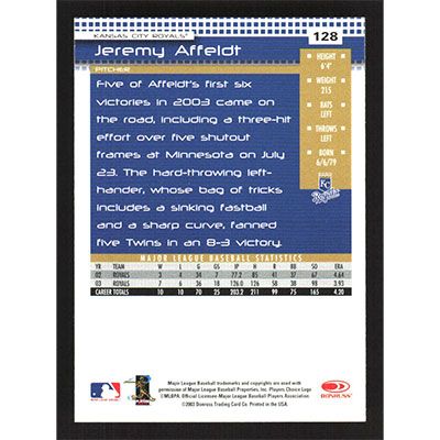 This is a 2004 Donruss Jeremy Affeldt baseball card. The card is #128 and pictures show condition.