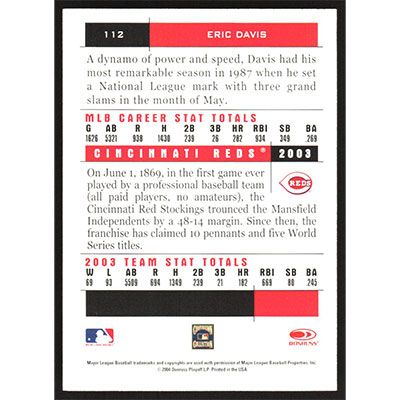 This is a 2004 Donruss Team Heroes Eric Davis baseball card. The card is #112 and pictures show condition.