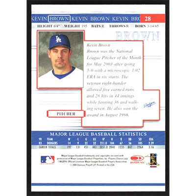 This is a 2004 Donruss Timelines Kevin Brown baseball card. The card is #28 and pictures show condition.