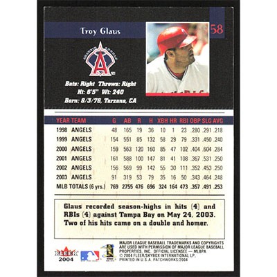 This is a 2004 Fleer Patchworks Troy Glaus baseball card. The card is #58 and pictures show condition.