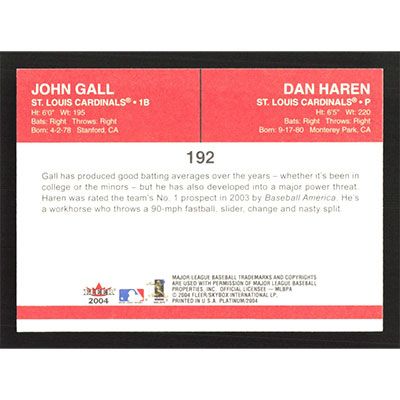 This is a 2004 Fleer Platinum John Gall and Dan Haren baseball card. The card is #192 and pictures show condition. Team(s): St. Louis Cardinals Rookie Card (RC)