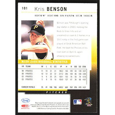 This is a 2004 Leaf Kris Benson baseball card. The card is #181 and pictures show condition.