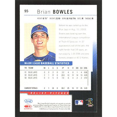 This is a 2004 Leaf Brian Bowles baseball card. The card is #95 and pictures show condition.