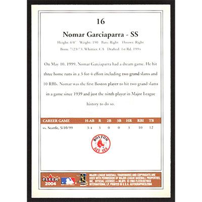 This is a 2004 SkyBox Autographics Nomar Garciaparra baseball card. The card is #16 and pictures show condition.