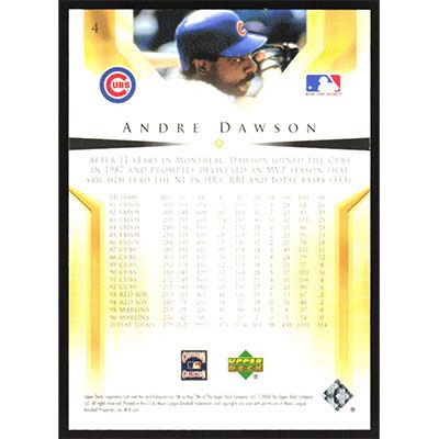 This is a 2004 SP Legendary Cuts Andre Dawson baseball card. The card is #4 and pictures show condition.