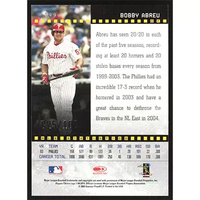 This is a 2004 Studio Proofs Silver Bobby Abreu baseball card. The card is #149 and pictures show condition. This card is limited; #'d 025/100. Team(s): Philadelphia Phillies