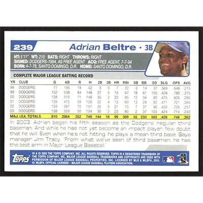 This is a 2004 Topps Adrian Beltre baseball card. The card is #239 and pictures show condition.