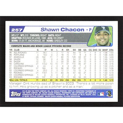 This is a 2004 Topps Shawn Chacon baseball card. The card is #257 and pictures show condition.