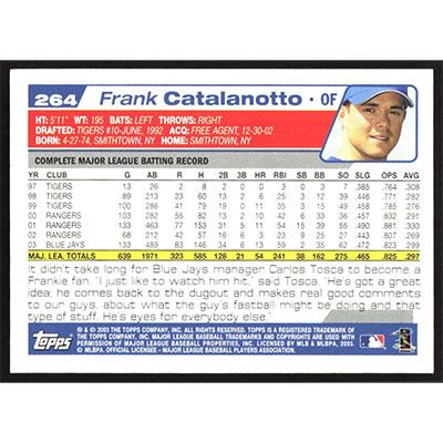 This is a 2004 Topps Frank Catalanotto baseball card. The card is #264 and pictures show condition.