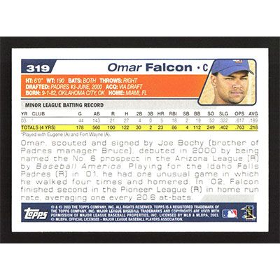 This is a 2004 Topps Omar Falcon First Year baseball card. The card is #319 and pictures show condition.