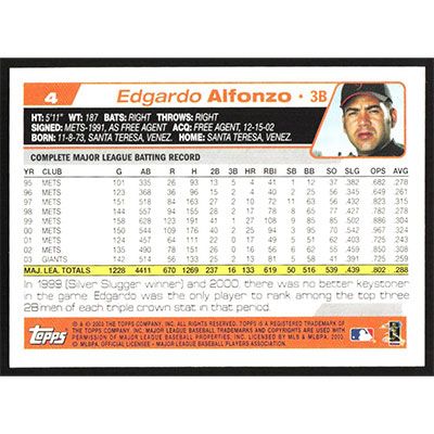 This is a 2004 Topps Edgardo Alfonzo baseball card. The card is #4 and pictures show condition.