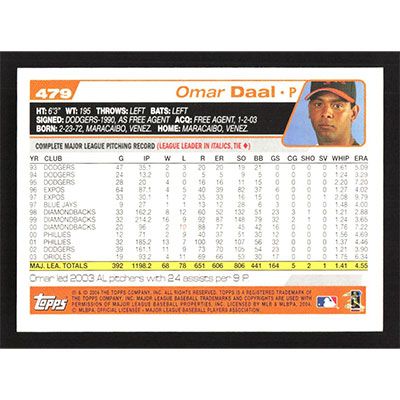 This is a 2004 Topps Omar Daal baseball card. The card is #479 and pictures show condition.