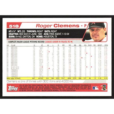 This is a 2004 Topps Roger Clemens baseball card. The card is #518 and pictures show condition.