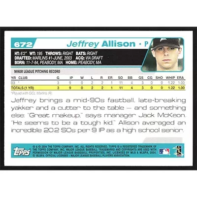 This is a 2004 Topps Jeffrey Allison Draft Pick baseball card. The card is #672 and pictures show condition. Team(s): Florida Marlins Rookie Card (RC)