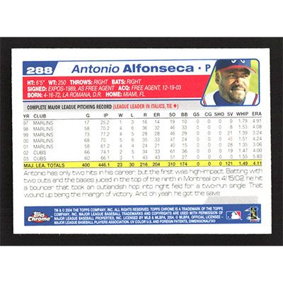 This is a 2004 Topps Chrome Antonio Alfonseca baseball card. The card is #288 and pictures show condition.