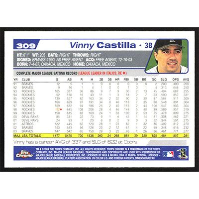This is a 2004 Topps Chrome Vinny Castilla baseball card. The card is #309 and pictures show condition.