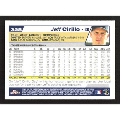 This is a 2004 Topps Chrome Jeff Cirillo baseball card. The card is #328 and pictures show condition.