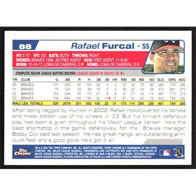 This is a 2004 Topps Chrome Rafael Furcal baseball card. The card is #88 and pictures show condition.