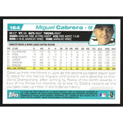 This is a 2004 Topps Opening Day Miguel Cabrera baseball card. The card is #164 and pictures show condition.