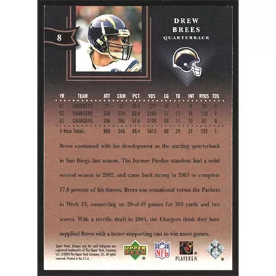 This is a 2004 UD Diamond All-Star Drew Brees football card. The card is #8 and pictures show condition.