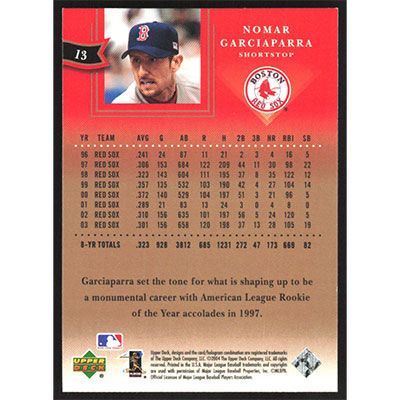 This is a 2004 UD Diamond Collection All-Star Nomar Garciaparra baseball card. The card is #13 and pictures show condition.